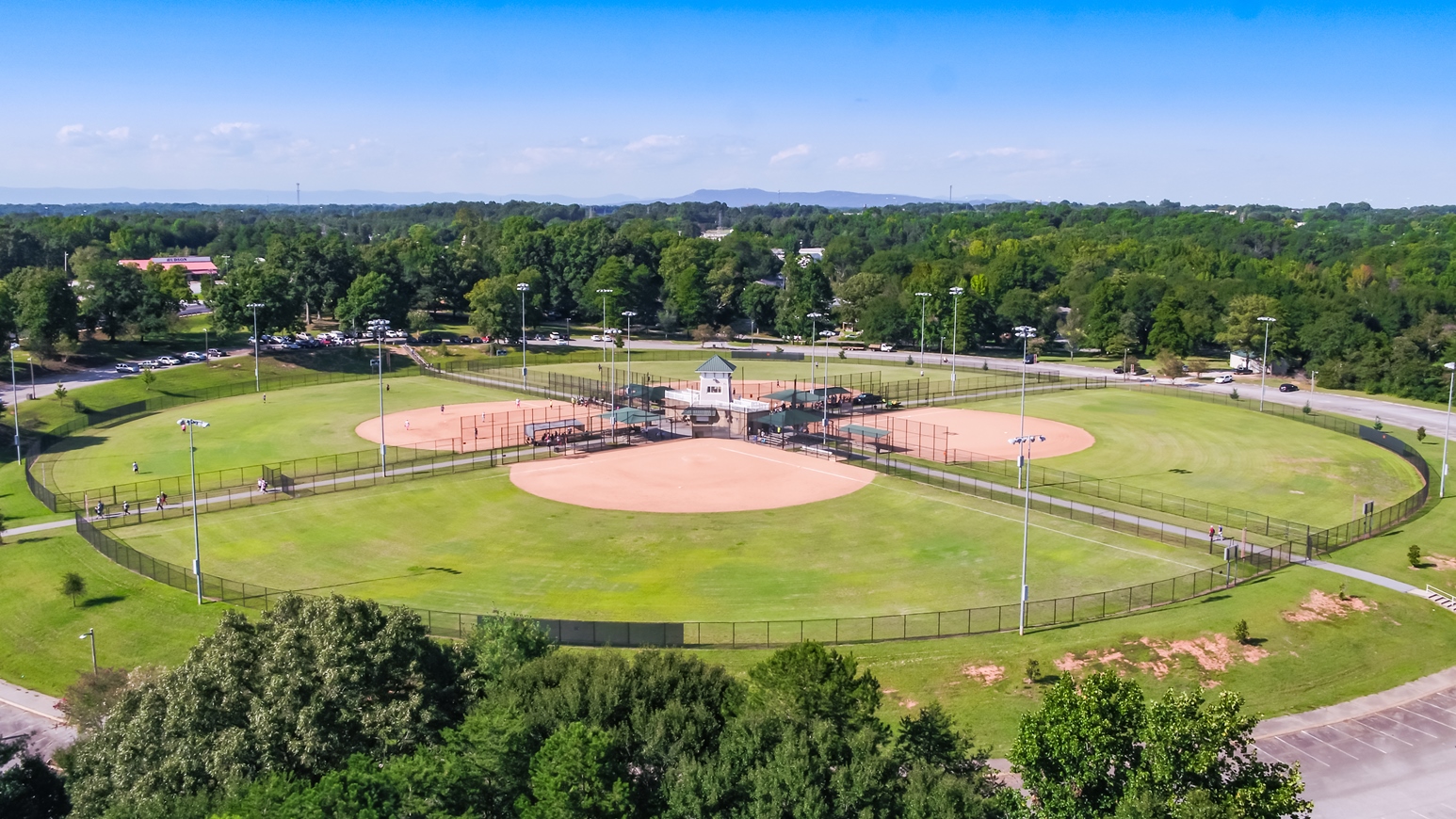 - Four lighted diamond baseball fields, all can accommodate dimensions up to 60’/90′